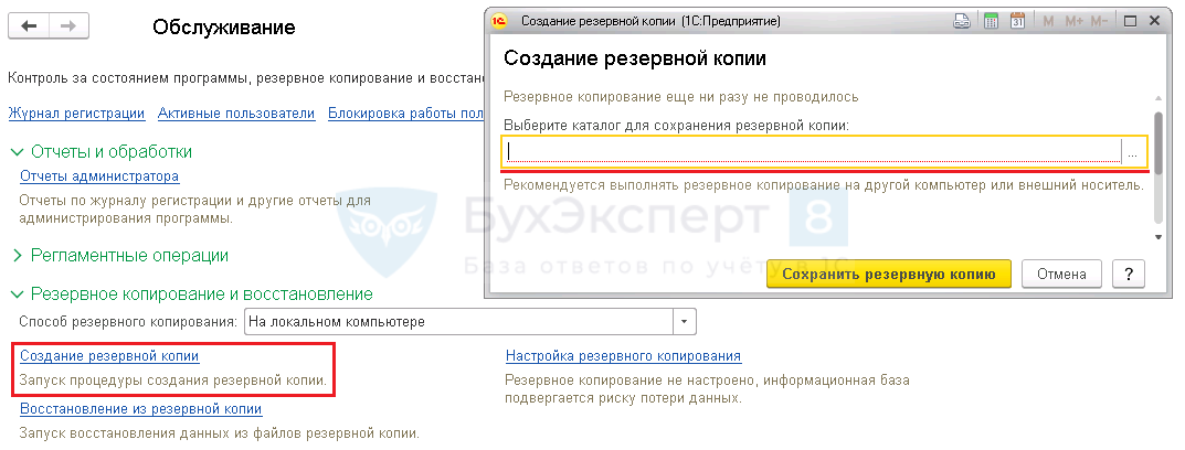 Проще всего выполнить создание резервной копии непосредственно из программы. Для этого следует воспользоваться сервисом создания резервных копий в разделе Администрирование – Обслуживание – Резервное копирование и восстановление (ссылка Создание резервной копии). В открывшемся окне необходимо указать путь к каталогу, в котором будет храниться резервная копия.