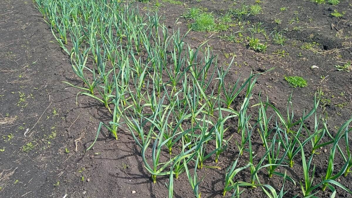 Дорогие подписчики и гости канала сегодня расскажу вам о первом весеннем уходе и первой подкормке чеснока. В первую очередь, как только взошел чеснок, а почва на грядке подсохла я провожу рыхление т. к. почва за зиму уплотнилась, рыхление увеличит доступ кислорода к корням что необходимо для хорошего развития растения. Перегной, которым я мульчировала грядку осенью после посадки, не убираю, а зарыхляю его в почву и заодно провожу прополку травы. При наличии у чеснока 3 - 4 листа проводим первую подкормку азотосодержащими удобрениями, это может быть аммиачная селитра, нашатырный спирт, карбамид (мочевина) и др. Я в этом сезоне использую нашатырный спирт с добавлением 3% перекиси водорода и аптечного йода. Подкормку проводим по влажной почве, если почва подсохла тогда необходимо грядку пролить водой. Азот для растения необходим для наращивания листьев, чем крупнее и мощнее листья, тем больше питания будет получать луковица чеснока, а чем больше питания, тем крупнее вырастит чеснок. Перек