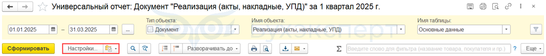 - Реализация (акты, накладные, УПД) — отчет будет формироваться по данным этого регистра
