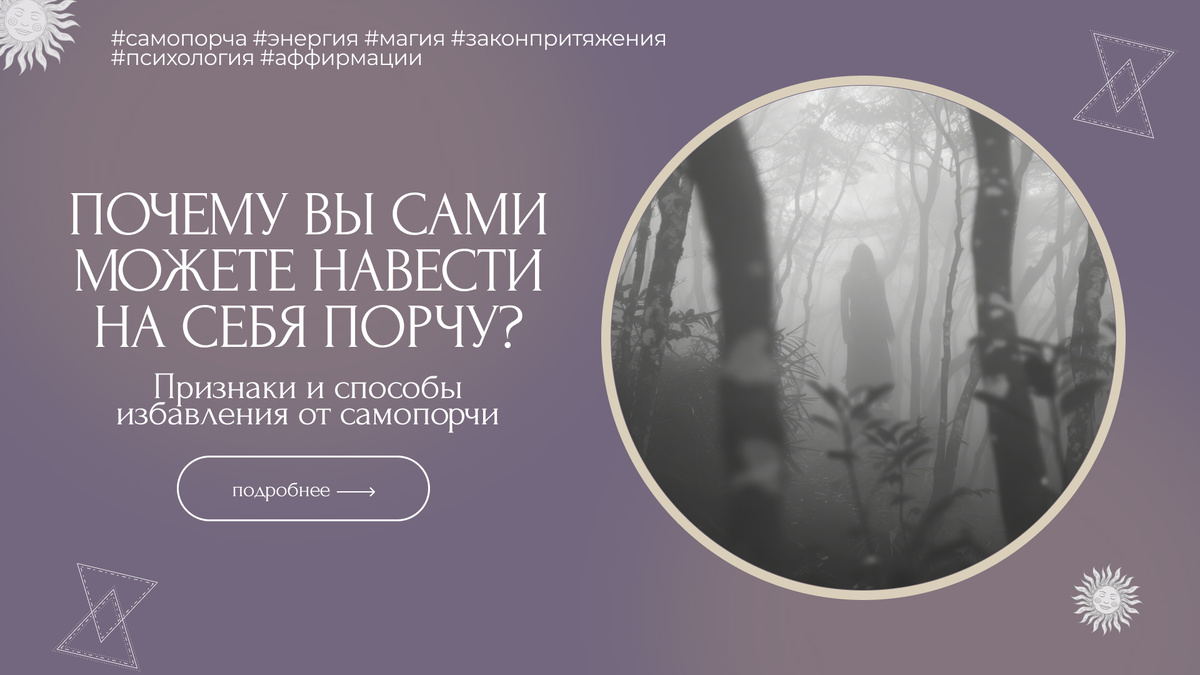Самопорча — это явление, о котором мало говорят, но которое встречается гораздо чаще, чем кажется. Это энергетическое воздействие, которое человек непроизвольно направляет на себя через негативные мысли, страхи, сомнения или действия. Разберёмся, что такое самопорча, как её распознать и, главное, как избавиться от её разрушительного влияния. 🌟 Определение: