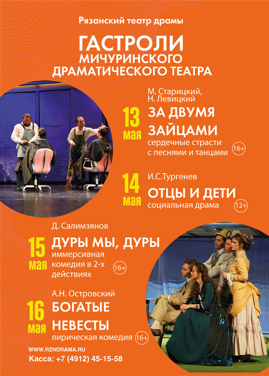 Рязанцев пригласили на гастроли Мичуринского драматического театра. Об этом сообщает пресс-служба театра драмы. С 14 по 16 мая 2025 года пройдут гастроли одного из старейших театров Тамбовской области — Мичуринского драматического театра, который покажет спектакли: