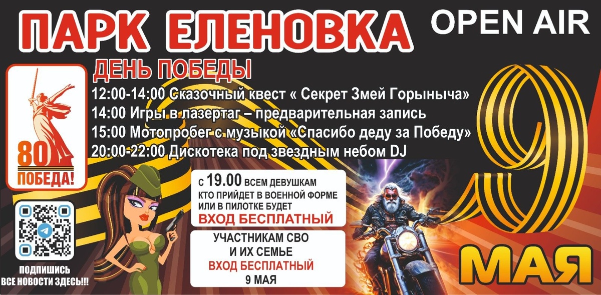 ⭐ Друзья! 9 мая приглашаем принять участие в РЕТРОАВТО-МОТОПРОБЕГЕ и ТРОФЕЙНОЙ ТЕХНИКИ, посвящённом 80-й годовщине Великой Победы - "Спасибо деду за Победу!" 🎆 Давайте с гордостью возьмём знамя Победы и промчимся по улицам! Пусть рев моторов станет символом нашего уважения и благодарности всем тем, кто сражался за свободу и независимость нашей страны! 🏍🇷🇺 🏁 Собираемся в парке Еленовка в 13:00, старт - 15:00. Будем рады видеть каждого из вас! 🙌 ☝С 20:00 до 22:00 дискотека под звездным небом с DJ. ❗С 19:00 всем девушкам кто придет в военной форме или пилотке вход бесплатный! ❗Участникам СВО и их семьям (при предъявлении документа) вход 9 мая бесплатно!