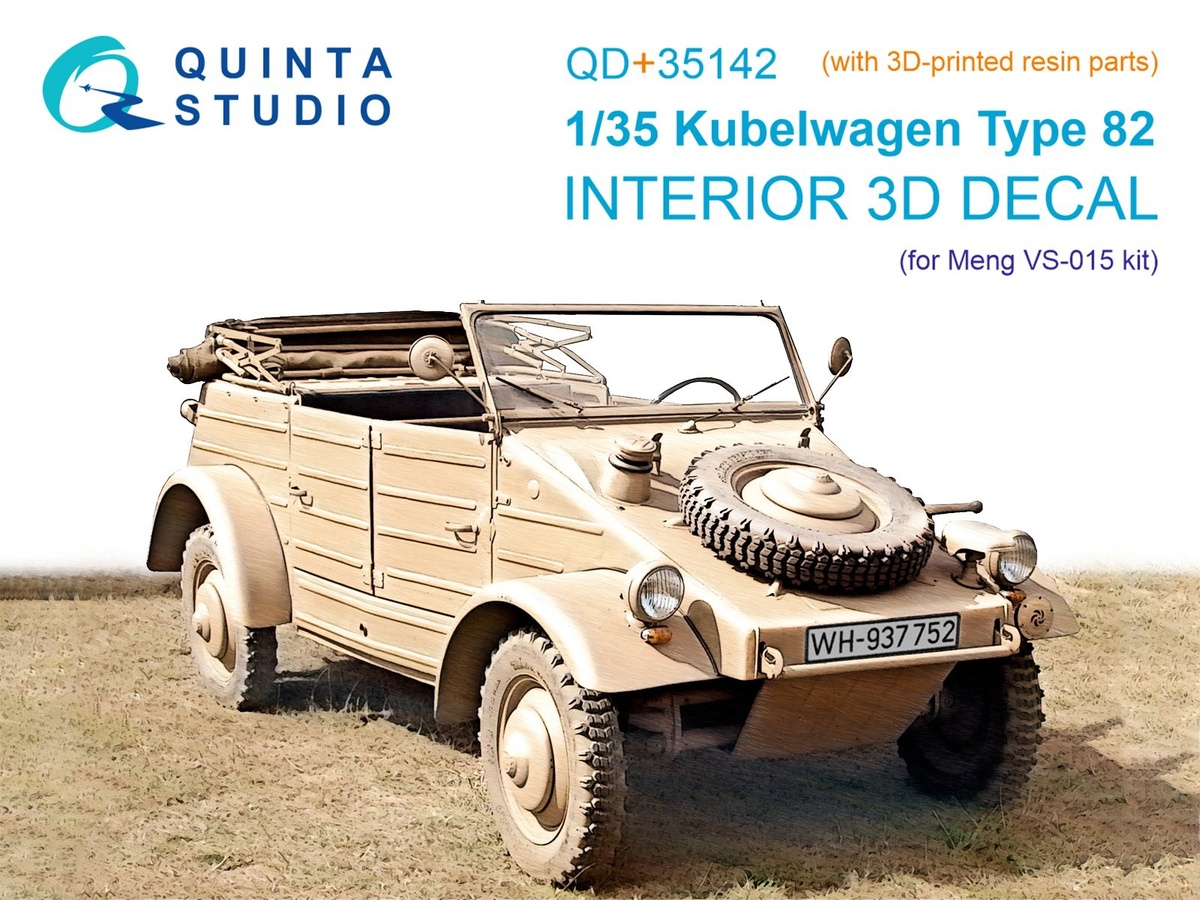 Quinta modelling studio из Пензы выпустила "трехмерную декаль" и выращенные на 3D-принтере детали для модели Kubelwagen Type 82 в масштабе 1/35 от Meng в полном и сокращенном - без выращенных на 3D-принтере деталей (буква S в каталожном номере) - вариантах: Kubelwagen Type 82 (каталожный номер QD+35142) Kubelwagen Type 82 (QDS-35142)