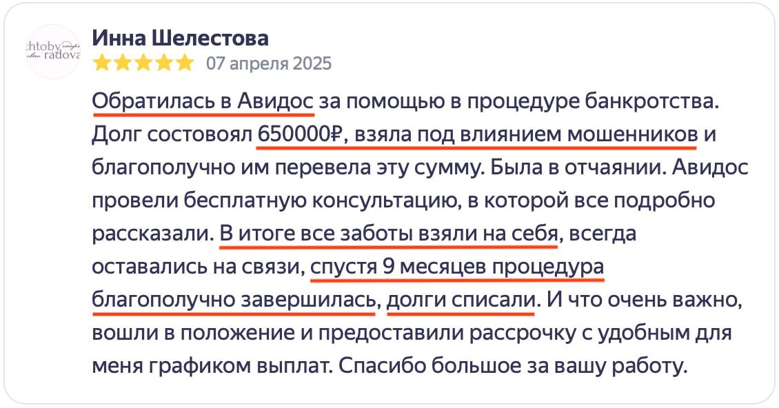 Спасибо за ваше доверие и такие искренние слова — каждая история, как ваша, напоминает нам, почему мы выбрали эту профессию ❤️. Мы понимаем, как тяжело было столкнуться с мошенничеством и долгами 😔, и рады, что смогли не только списать 650 000₽ 🎉, но и вернуть вам уверенность в завтрашнем дне 🌟. Бесплатная консультация, рассрочка и поддержка на всех этапах — это не просто услуги, а наша принципиальная позиция: клиент должен чувствовать защиту, а не стресс 🛡. Особенно ценно, что вы отметили нашу готовность «войти в положение» 🤝. Для нас важно, чтобы финансовая нагрузка не мешала вашей жизни, поэтому гибкие условия — это обязательное правило, а не исключение 💡. Если захотите помочь другим людям избежать подобных ситуаций, поделитесь вашим опытом в соцсетях 📢 (с вашего разрешения, мы можем помочь оформить пост или даже записать короткое видео 🎥). И конечно, мы всегда рядом, если вам или вашим близким понадобится помощь с недвижимостью 🏠 или семейными спорами 👨👩👧👦. Спасибо