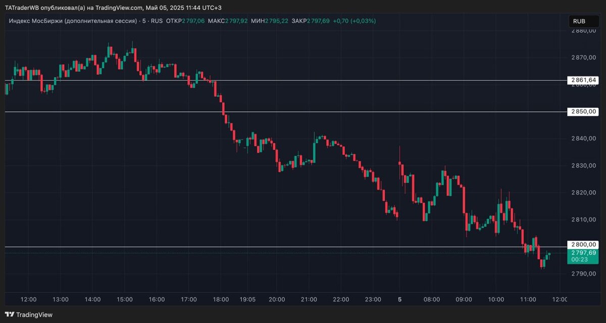 ❗️ Казалось бы индекс давно не касался 2800. Отскок очень вероятен… Он как раз таки был, однако на графике его НЕ видно, ибо происходило все на выходной торговой сессии. Инструменты чуть дали вниз с открытия субботы, тем самым условно дойдя до 2800, после чего пошли вверх. Сегодня же индекс пришел к уровню «впервые», но на самом деле нет.