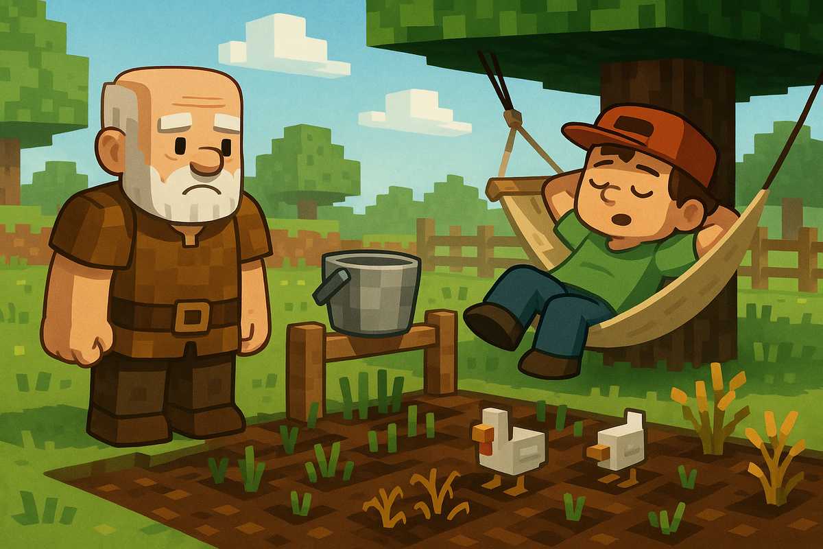 Что получится, если заменить труд «волшебным» ведром? Поучительная сказка для детей, которая наглядно показывает: лень всегда приводит к пустым сундукам и грустным последствиям. Читайте и обсуждайте с ребёнком — почему даже в Minecraft ничего не растёт само! Дядюшка Пит разбудил Максимку на рассвете: