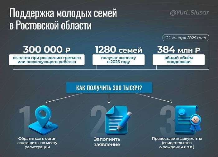 Новая мера поддержки действует с 1 января этого года. В Ростовской области с начала года 96 молодых многодетных семей воспользовались новой мерой поддержки. Речь идет о единовременной денежной выплате в размере 300 тыс. рублей на третьего или последующего ребенка. Новая социальная мера поддержки стала возможной благодаря нацпроекту «Семья» и региональной программе по поддержке рождаемости, сообщил в своем Telegram врио губернатора Юрий Слюсарь. Выплаты получили многодетные семьи Таганрога, Новочеркасска, Новошахтинска, Ростова, а также из Багаевского, Белокалитвинского, Миллеровского, Октябрьского районов и других муниципалитетов Дона. Всего в 2025 году планируем выплатить 1300 таких субсидий на общую сумму почти 400 млн рублей федерального и областного бюджетов. Получить выплату можно без учета уровня дохода, уточнил Слюсарь.