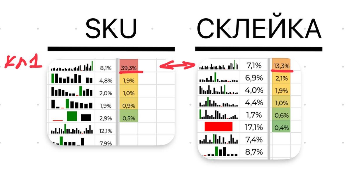 Поэтому, если видите высокий ДРР у конкретного SKU — проверьте тысячу раз, какой ДРР у всей склейки.