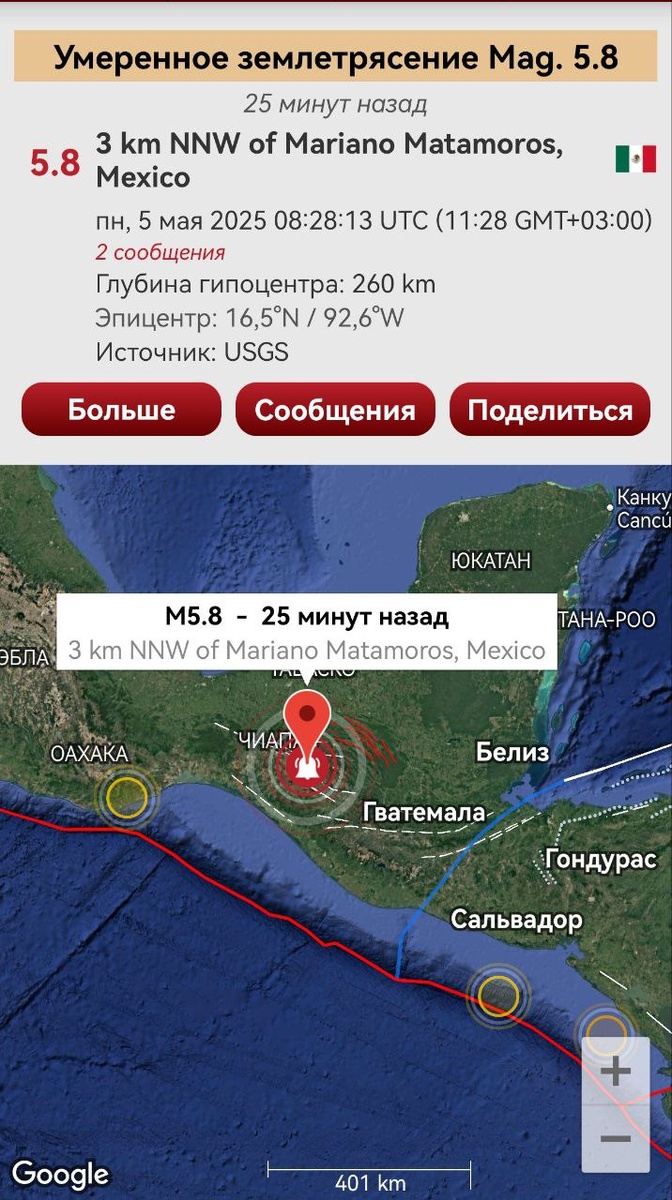 В ответ на пост Согласно прогнозу от 1 мая произошло землетрясение М5.8 в Мексике 🇲🇽 Еще одно предупреждение по данной зоне было опубликовано вчера. ==== According to the forecast of May 1, the M5.8 earthquake occurred in Mexico 🇲🇽