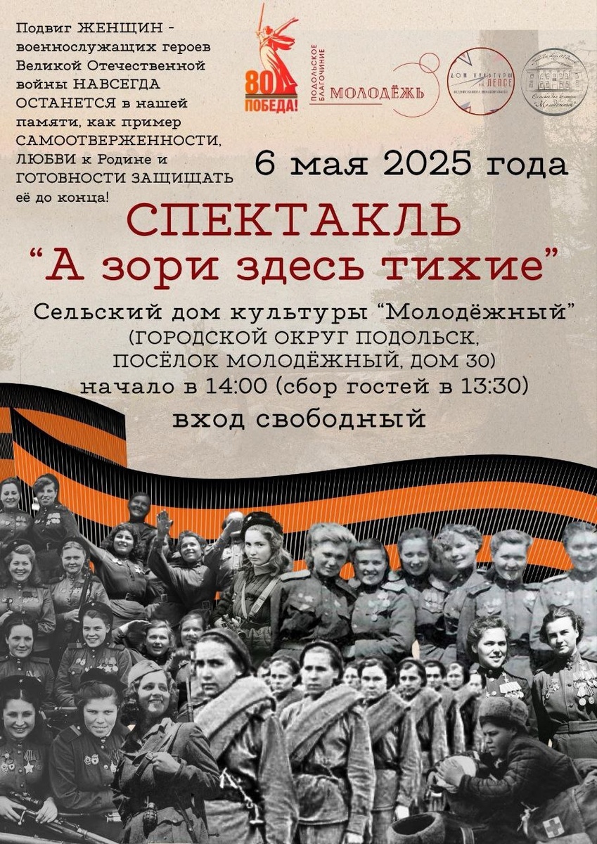 ✨ Спектакль по мотивам повести «А зори здесь тихие» 🪖Поставлен молодёжью Подольского благочиния под руководством режиссёров: Комарова Л.В. и Кузнецова Л.Ю., бережно воссоздает атмосферу знаменитого произведения Бориса Васильева — трогательной истории о пяти девушках-зенитчицах, защищавших Родину от фашистских захватчиков во время Великой Отечественной войны. 🚫 Возраст: 12+ 📆 06.05.2025 🕒 14:00 🏢 СДК «Молодежный» 📍 г.о. Подольск, пос. Молодёжный, д.30 💰 Вход свободный❗️ #webПодольск ✅ Мероприятия Подольск https://dzen.ru/id/66ed500f7b5671493eca3fd6 http://vk.com/podolsk_events http://dzen.ru/podolsk_events