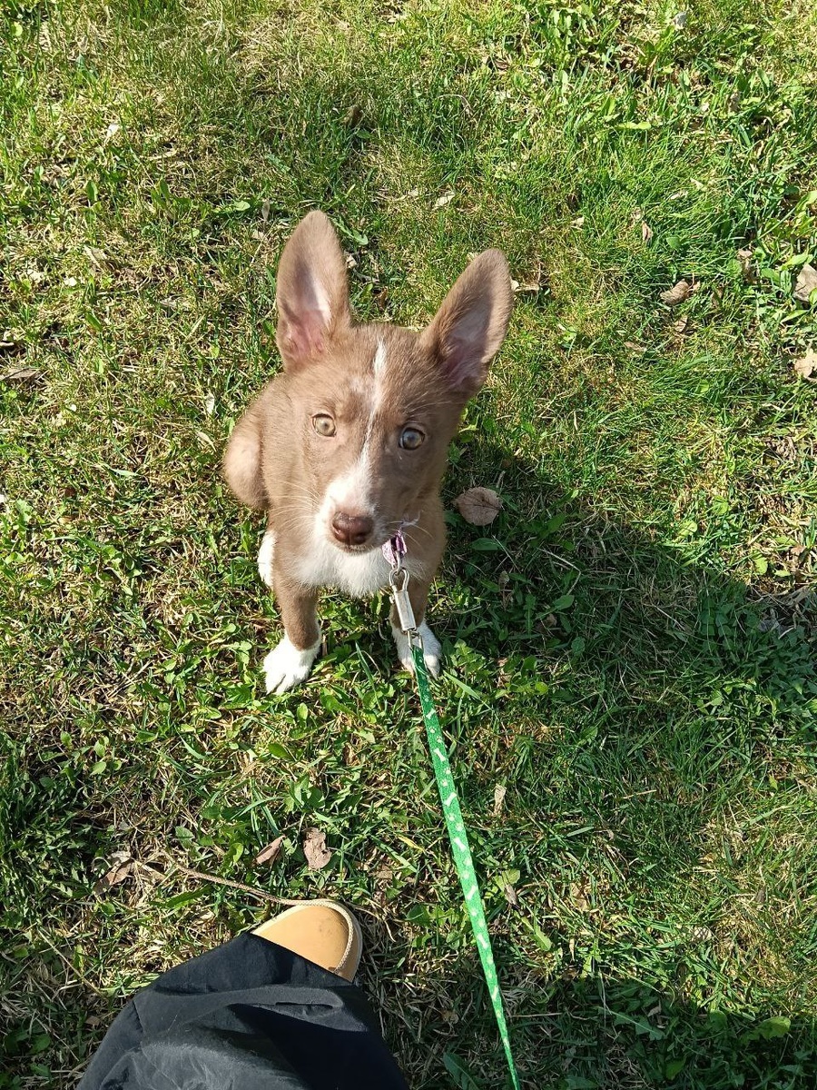 Знает команды "место" и "сидеть", команда "можно" еще осваивается.