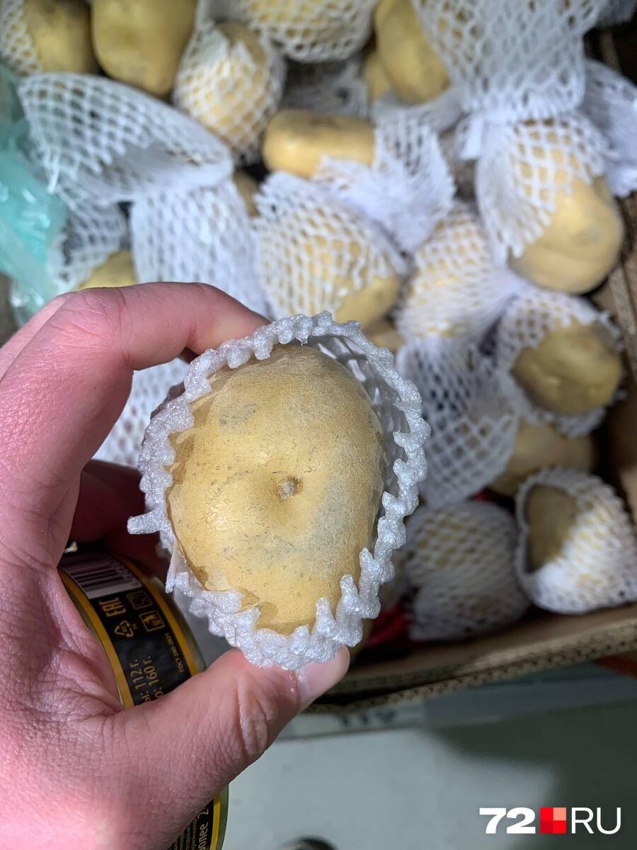 Клубни элитной картошки чистые и достаточно крупные. Продают их в индивидуальной защитной сетке. Обычно так фасуют дорогие экзотические фрукты или дорогие сорта помидоров.
