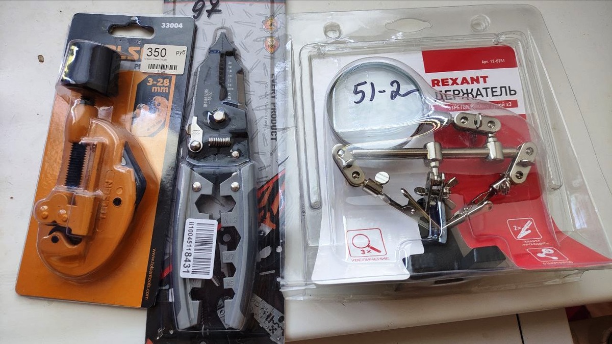 Вот так бывает, купишь, а до использования дело так и не дошло, у меня 3 таких инструмента, которые даже не распечатал, лежат в заводских упаковках. Устанавливал родственнице шкафы-купе, а там оказались трубки для вешалки не в размер, пришлось пилить болгаркой. Тогда подумал: вот был бы с собой специальный труборез, раз, два и готово. И когда он мне попался, не задумываясь купил, но до сих пор работы для него не нашлось, так и лежит. Год назад, менял датчик Холла (датчик коленвала) на трамблёре. При установке сперва отлетел один провод от контактной пластины. Вытащил пластину, припаял, отлетел второй, припаял, и сразу третий, не стал ждать, пока отвалился. Занятие оказалось крайне неудобно, пришлось зажимать пластины спичечным коробком, в общем, намучился. Эх, мне бы специальный держатель, который часто встречал на просторах интернета, вот и приобрёл. А работы для него пока нет, так и пылится. Этот инструмент приобрёл, считай по акции, за накопленные балы и 1 р. Он по рекламе и гайки