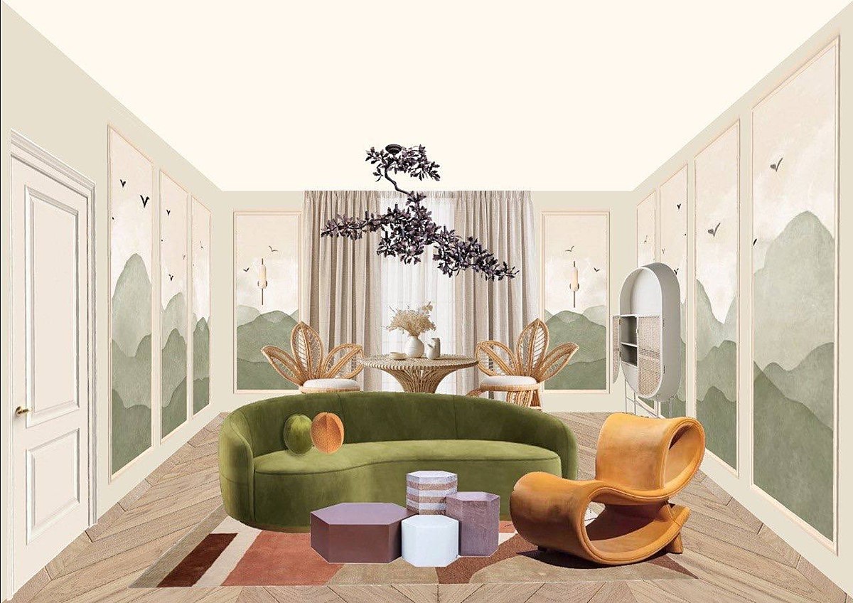 Олеся использовала необычный прием - обои с принтом внутри молдингов! Это добавило жизни в интерьер и прекрасно отразило холмы зелени с картинки вдохновения. Плетеная столовая группа, увенчанная люстрой в виде ветви, отсылает нас к деревянным стульям в тени деревьев. А диванная группа наполняет интерьер красками 😍