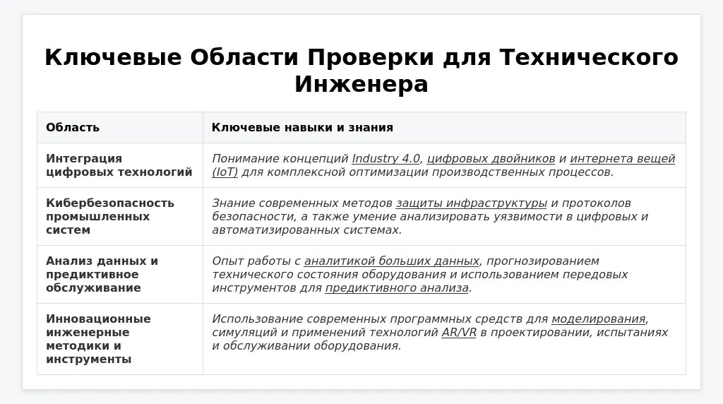 Актуальные области знаний на 2025 год: важны навыки в интернет вещей (IoT), цифровизации производственных процессов, управлении данными, кибербезопасности и энергетической эффективности.