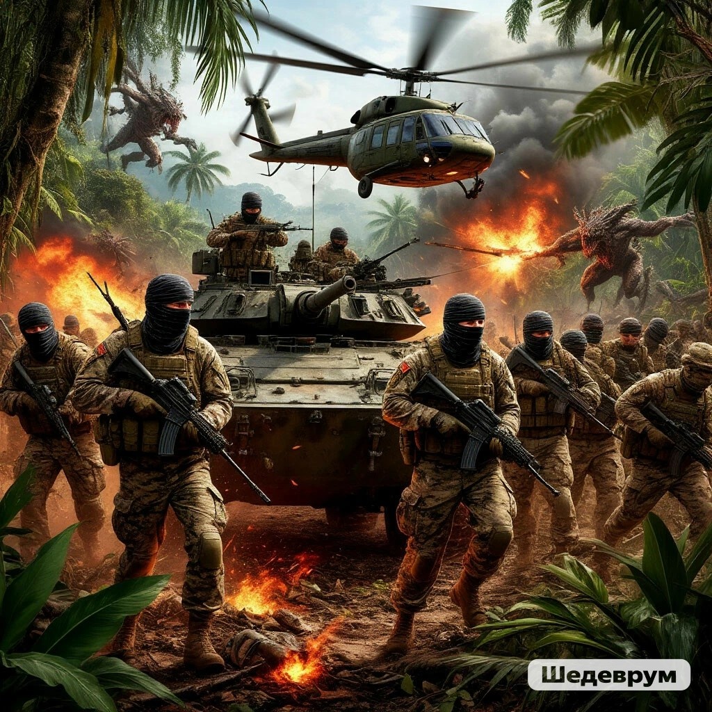 Командор не мог видеть всю картину боя, а запись с вертолёта передавала только горящие джунгли. Узнав от Мазая обстановку, он отдал приказ на челнок, бомбондировать следующие 15 км лесной дороги объемными зарядами. Колонна шла достаточно ходко, выжигая чащу и всё что из неё выходило. Но несмотря, на казалось бы слаженную работу, они уже потеряли два танка и три БМП. Что было с теми кто пытался спастись, описывать не стоит, они становились едой..