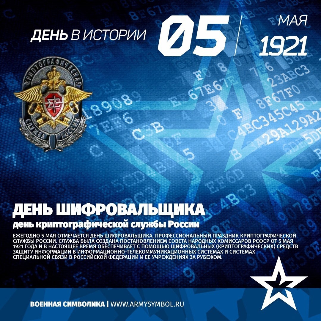 День Шифровальщика Ежегодно 5 мая отмечается День шифровальщика, профессиональный праздник криптографической службы России. Служба была создана постановлением Совета народных комиссаров РСФСР от 5 мая 1921 года и в настоящее время обеспечивает с помощью шифровальных (криптографических) средств защиту информации в информационно-телекоммуникационных системах и системах специальной связи в Российской Федерации и ее учреждениях за рубежом. #ПамятныеДатыВоеннойИсторииОтечества #ДеньВИстории #ГодЗащитникаОтечества #80ЛетВеликойПобеды Источник: https://vk.com/wall-60767131_30564 Подпишитесь на наши группы ВКонтакте и в Одноклассниках - читайте, смотрите и комментируйте! Источник