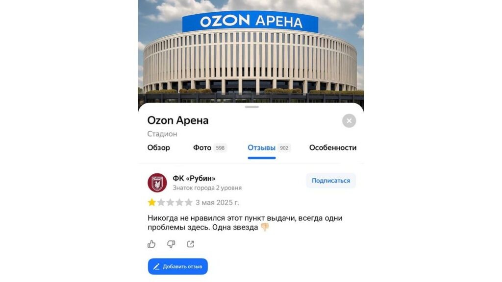 После матча, в котором «Рубин» уступил «Краснодару», пресс-служба казанской команды решила пошутить, высмеяв новое имя стадиона соперника. На официальной странице «Рубина» в Telegram появился пост с ироничным посланием. Администраторы опубликовали скриншот негативного отзыва о пункте выдачи маркетплейса, в котором клиент жалуется на постоянные проблемы. Никогда не нравился этот пункт выдачи, всегда одни проблемы здесь. Одна звезда, — говорится в сообщении. Напомним, матч прошел на домашнем стадионе в рамках 27-го тура Мир Российской Премьер-лиги. «Быки» обыграли «Рубин» со счетом 2:1. Победа позволила «Краснодару» сохранить лидерство в турнирной таблице чемпионата России. Казанский «Рубин» после поражения остался на седьмом месте.