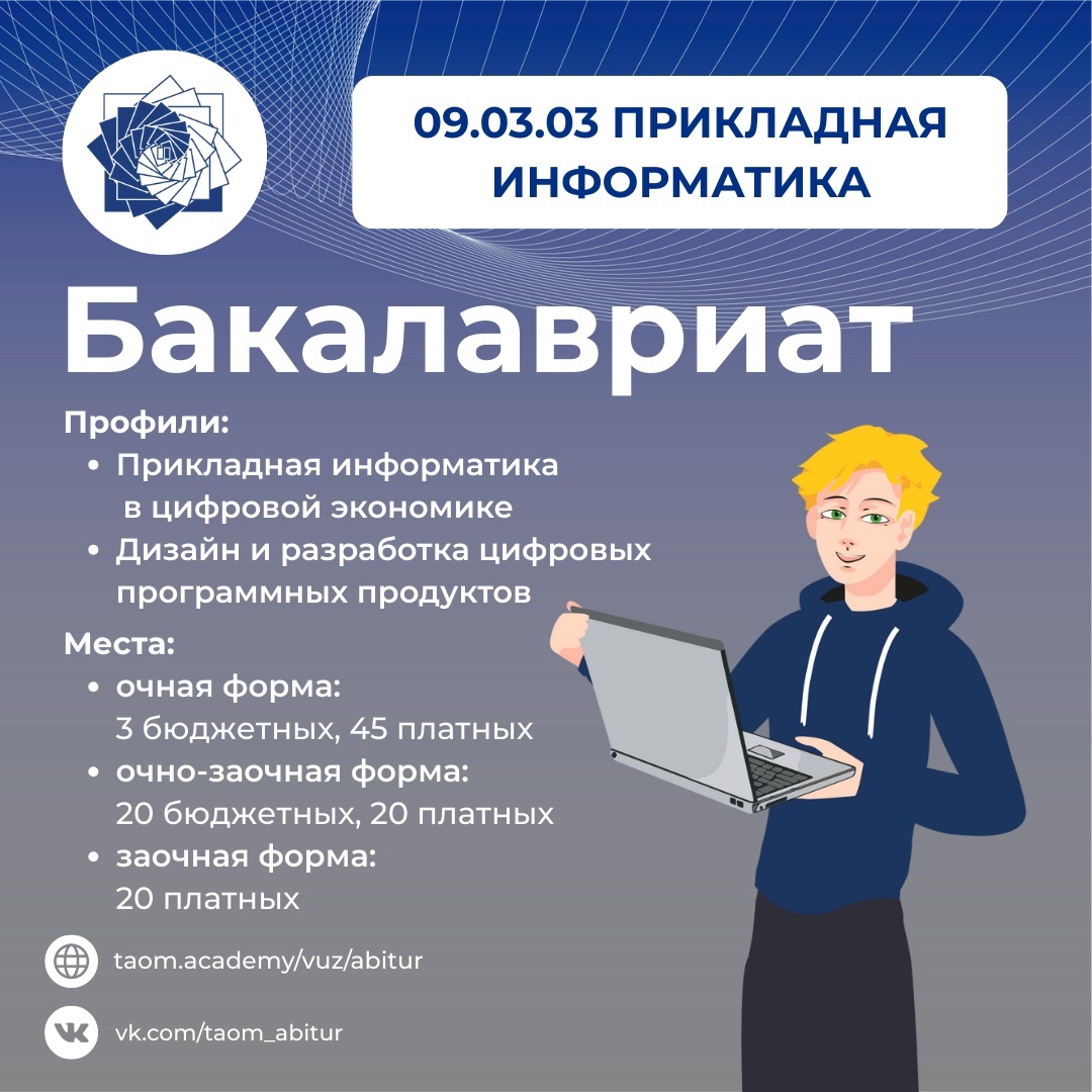 «09.03.03 Прикладная информатика» — одно из самых востребованных и популярных направлений подготовки в условиях постоянно изменяющейся цифровой экономики. Оно касается вопросов внедрения инновационных IT-разработок в реальную жизнь. Выберите свой профиль обучения: В 2025 году доступно 108 мест для поступления: Постройте свою успешную карьеру в IT вместе с ТАУ! Подробнее об условиях поступления: taom.academy/vuz/abitur. Ответим на ваши вопросы: Почта: abitur.taom@gmail.com Телефоны: +7 (8482) 555 044 (информационное агентство) и +7 (8482) 736 036 (учебный отдел) #ТАУ #тольяттинскаяакадемияуправления #ПК2025 #приемнаякампания2025 #направленияподготовки #абитуриентам #бакалавриат #ПрикладнаяИнформатика