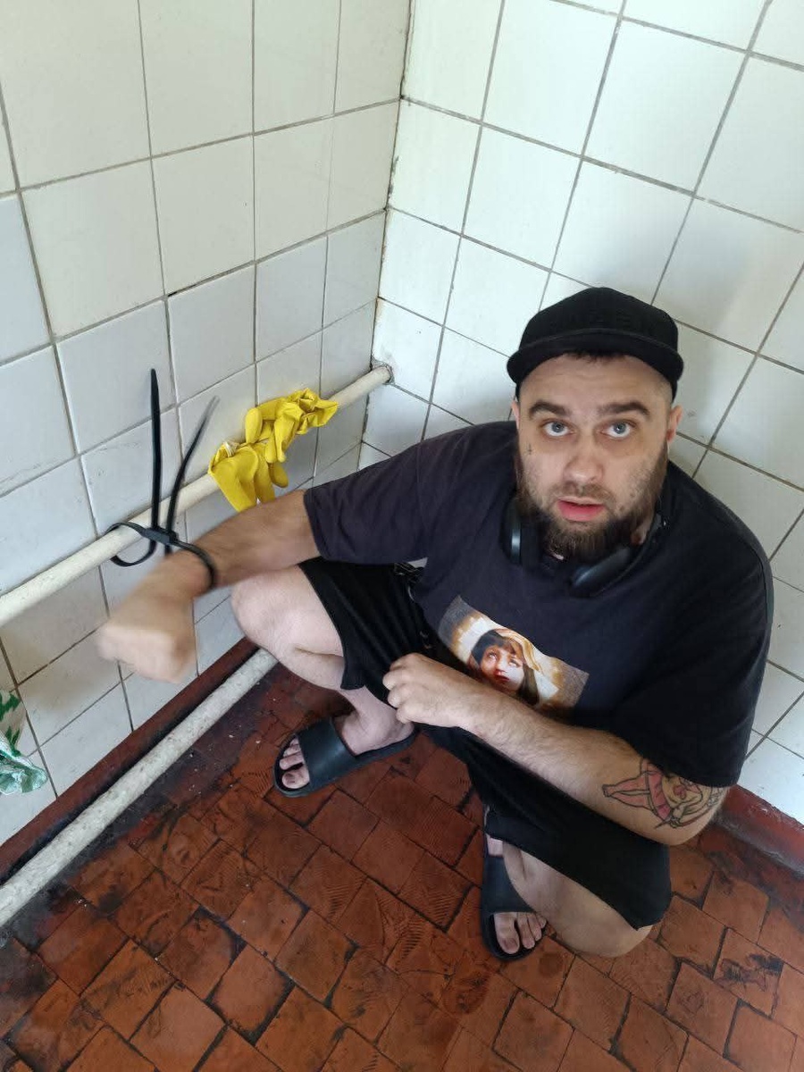 Ещё фото прикованного мужчины, которого на днях сфотографировали в военкомате на ДВРЗ (Киев). Раньше публиковались фото, как его приковали стяжкой кровати, теперь появились кадры, как он сидит привязанный к батарее в туалете. #нерабы #намясо #могилищация