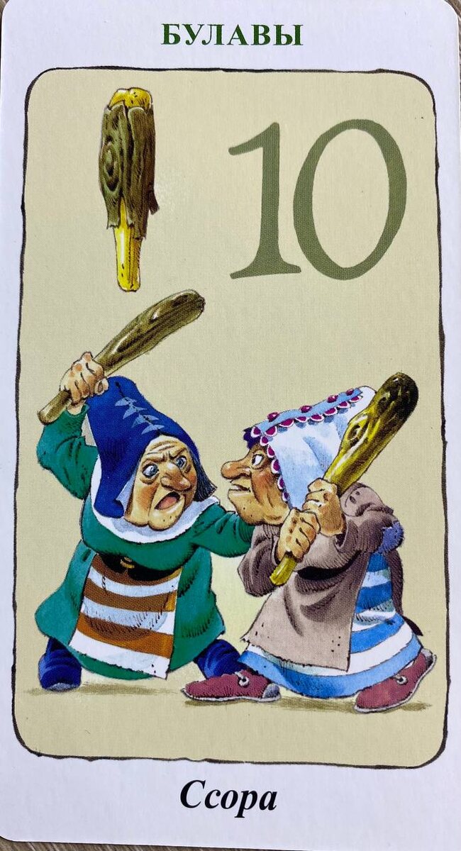 Нижняя справа. Десятка булавы - перевернутое значение. На карте изображена ссора. Перевернутое значение, здесь, не говорит о том, что эта ссора иссякает. Оно рассказывает нам о внутреннем конфликте в коллективе. Часто может указывать на ссоры и дележку между учредителями, учредителями и руководителями. Так же может указывать на «засланного казачка» в коллективе. Ту все про разделение, разделенность, конфликтность. Если вы только собираетесь входить в проект, подумайте о том, что в нем возможны такие внутренние разрывы, что прибыль будут делить таким образом, что кто сколько успел себе взять, столько и получил, либо это будет лишь разовая выплата, что не окупит ваших вложений средств и сил. Если вы хотите прокредитоваться, то это будут жесткие условия, когда вам придется отдавать все сполна. Оцените, что вам важнее - проект или ваше спокойствие? Если есть силы и желание, то вам придется проявить себя очень активно - загрызть врага. Хотите спокойствия? Тогда найдите другу работу,