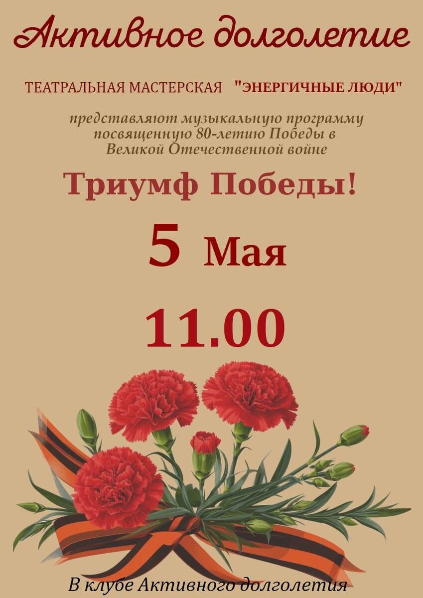 ✨ Ждём на праздничный концерт "Триумф Победы" В клубе Активное долголетие состоится концерт, посвященный 80-летию Победе🇷🇺 🚫 Возраст: 55+ 📆 05.05.2025 🕛 11:00 🏢 ДС «Олимпийский» им. В. С. Максимова 📍 г. Чехов, ул. Полиграфистов, стр.30 🪙 Вход свободный❗️ ✅ Мероприятия Чехов https://dzen.ru/id/66cc4b48e9ef144699238a51 http://vk.com/chekhov_events http://dzen.ru/chekhov_events