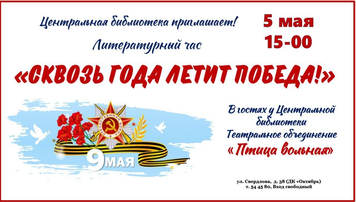 ✨ Литературный час в библиотеке Театральное объединение "Сквозь года летит Победа" 🚫 Возраст: 6+ 📆 05.05.2025 🕒 15:00 🏢 Центральная библиотека 📍 г. Подольск, ул. Свердлова, д. 38 💰 Вход свободный❗️ #webПодольск ✅ Мероприятия Подольск https://dzen.ru/id/66ed500f7b5671493eca3fd6 http://vk.com/podolsk_events http://dzen.ru/podolsk_events