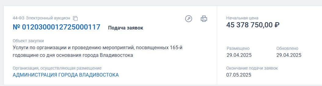 День рождения Владивостока в 2025 году властям обойдется максимум в 45 миллионов рублей. Четверть суммы планируют потратить на проведение концерта: 🟥2 миллиона рублей — услуги режиссёрской группы; 🟥3 миллиона рублей — выступление местных коллективов; 🟥6 миллионов рублей — выступление хедлайнера, кто это будет, пока не известно. Дата и время проведения мероприятия не указаны, скорее всего это будут первые выходные после официальной даты — 2 июля. По критериям заказчика вместимость площадки для торжества должна быть не менее 20 тысяч человек, рядом должны быть остановки общественного транспорта и парковки в пешей доступности, а главное — площадка должна находиться в центре города Владивостока. подрядчику необходимо разработать дизайн праздничного оформления и напечатать баннеры, не позднее 27 июня установить сцену с оборудованием, обеспечить прямую трансляцию концертной программы на экранах главной сцены, провести уборку территории после праздника, организовать охрану и работу ту