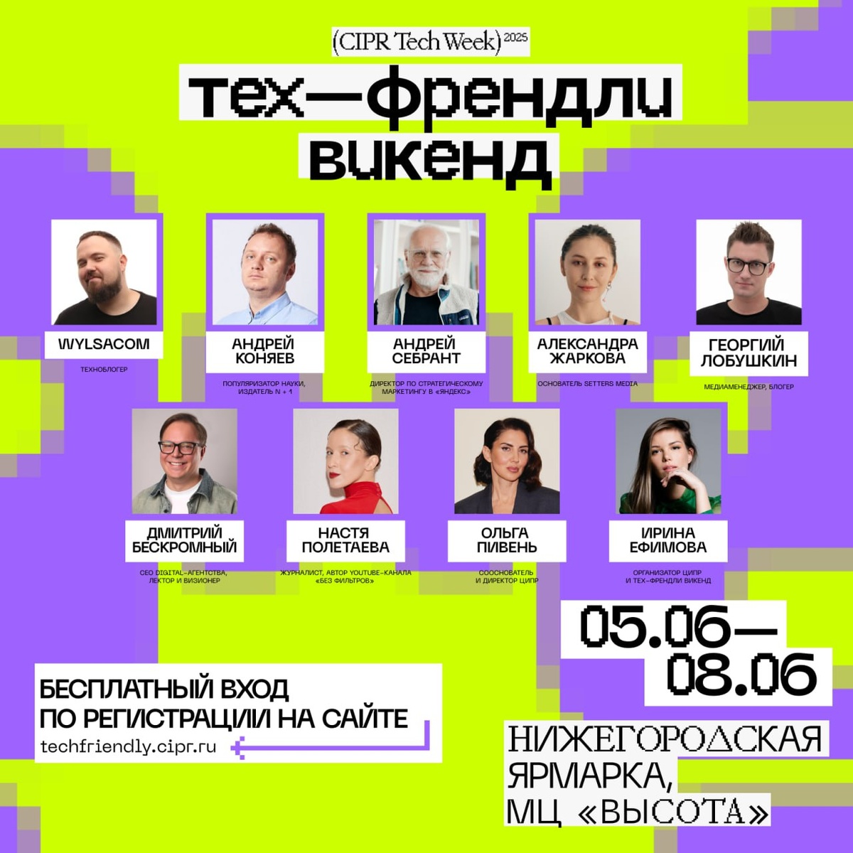 Тех-френдли викенд в Нижнем Новгороде 5-8 июня, вход свободный, необходима регистрация Wylsacom, Андрей Себрант, Александра Жаркова, Анастасия Полетаева и десятки топ-спикеров в деловой программе. С 5 по 8 июня Нижний Новгород станет центром разговора о технологиях, которые уже сегодня меняют бизнес, медиа, образование и творчество. Также на площадках «Нижегородской ярмарки», молодежного центра «Высота» и других выступят: • Андрей Коняев – N+1. • Даниил Трабун – AI-евангелист. • Катя Коновалова – Sila Sveta. • И другие лидеры ИТ, науки, креативных индустрий и бизнеса. Главная тема – ИИ и креатив. В программе 8 тематических треков: финансы, медиа, искусство, экология, образование, мода, маркетинг и человеческий капитал. Студенты и школьники тоже в центре внимания. Специальная программа про карьеру, цифровую безопасность и как говорить с нейросетями на одном языке. А ещё живая музыка, фудтраки, спорт и вечеринки Всё это в рамках нашей бесплатной программы, просто зарегистрируйся