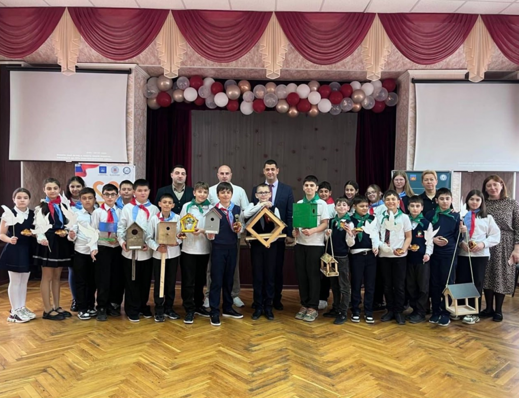 После торжественной части встречи делегаты от классов вместе с руководителями приняли участие в развешивании скворечников и кормушек, изготовленных своими руками, во дворе школы и в центральном парке села Чалтырь.