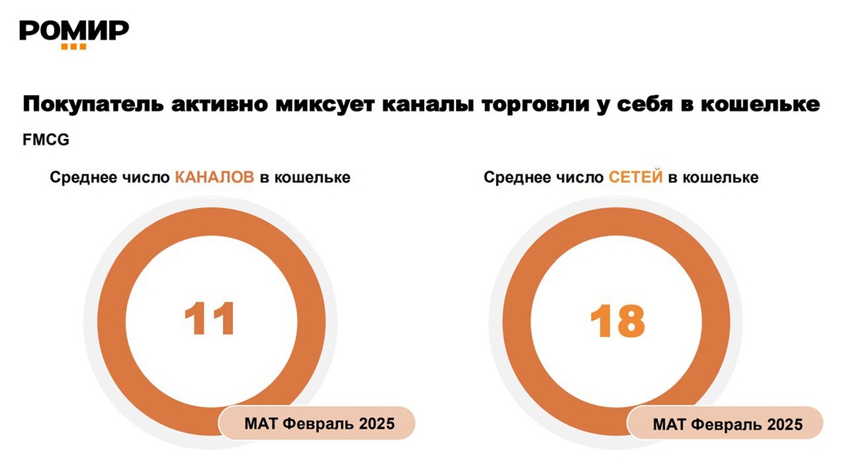 Российский ритейл укрупняется: рост числа каналов в кошельке покупателя РОМИР представляет анализ ключевых трендов в отечественном ритейле за последние четыре года, выявляющий значительные структурные трансформации. Рост современной розницы Ключевым индикатором изменений является неуклонный рост доли современных форматов торговли в общем объеме FMCG-продаж. 🔸Январь 2020 – Февраль 2021: 75% денежных трат потребителей. 🔸Январь 2024 – Февраль 2025: 81% денежных трат потребителей. За четыре года современная розница укрепила свои позиции на 6 процентных пунктов, продолжая вытеснять традиционные форматы. Ускорение консолидации Наиболее ярко структурные сдвиги проявляются в консолидации рынка вокруг крупнейших игроков. 🔸Доля ТОП-10 ведущих розничных сетей в FMCG-расходах выросла с 38% (2020-2021 гг.) до знаковой отметки в 50% (2024-2025 гг.). 🔸Рост на 12 процентных пунктов за четыре года указывает на активное перераспределение рынка в пользу лидеров. Фактически, половина всех дене