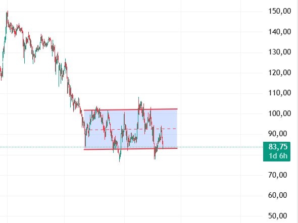 $FLOT Совкомфлот находится в среднесрочно нисходящем тренде. 🕯В данный момент актив строит Флаг. Нижней стенкой флага (уровень поддержки) является 83.18. При пробитии нижней стенки флага, вероятное падение актива ниже 50. Верхней стенкой флага (уровень сопротивления) является 102.34. При пробитии верхней стенки, флаг будут сломан и возможен рост актива до 125. ✅ По фундаментальному анализу можно увидеть снижение ключевых показателей из-за падения спотовых ставок фрахта и увеличения простоя судов, вызванного санкциями. Чистый убыток по РСБУ вырос в 1 квартале 2025 года по сравнению с аналогичным периодом прошлого года в 5.3 раза до 296.8 млн.руб. против 55,5 млн.руб. годом ранее. Эти факторы негативно влияют на ценообразование и в 2025 году не исключены изменения в дивидендной политике. Покупка акций Совкомфлота в данный момент считаю нецелесообразным. Не ИИР #теханализ #трейдер #инвестиции #FLOT