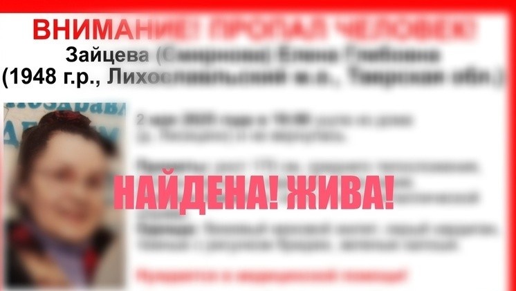 В Тверской области нашли живой 77-летнюю Елену Зайцеву. О благополучном завершении поисков сообщили волонтеры ВПСО "Сова".