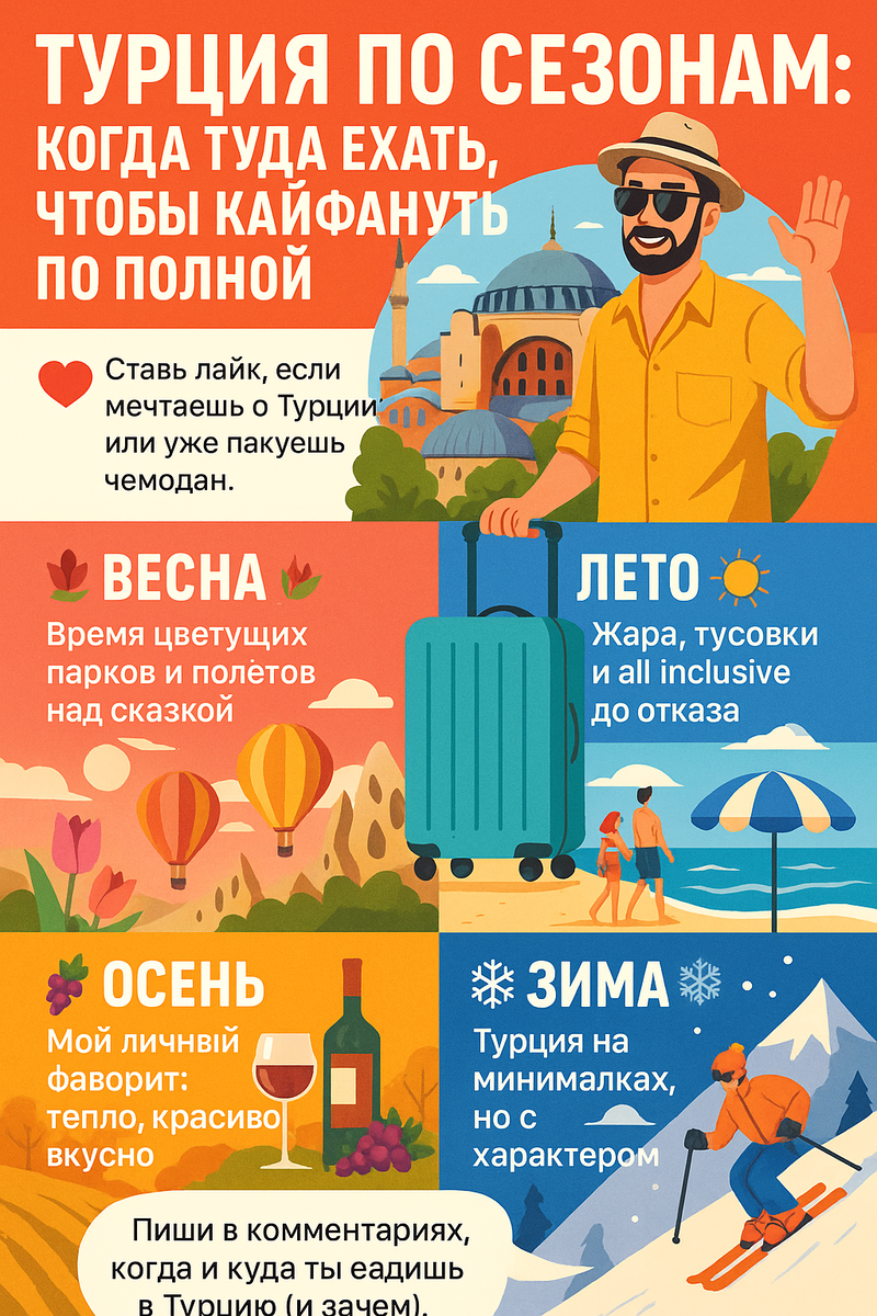 Так что держи мой разбор: когда ехать, чтобы Турция была как в кино. Март, апрель, май — просто золото. Пока Европа еще кутается в шарфы, Турция уже светит солнцем и тюльпанами.