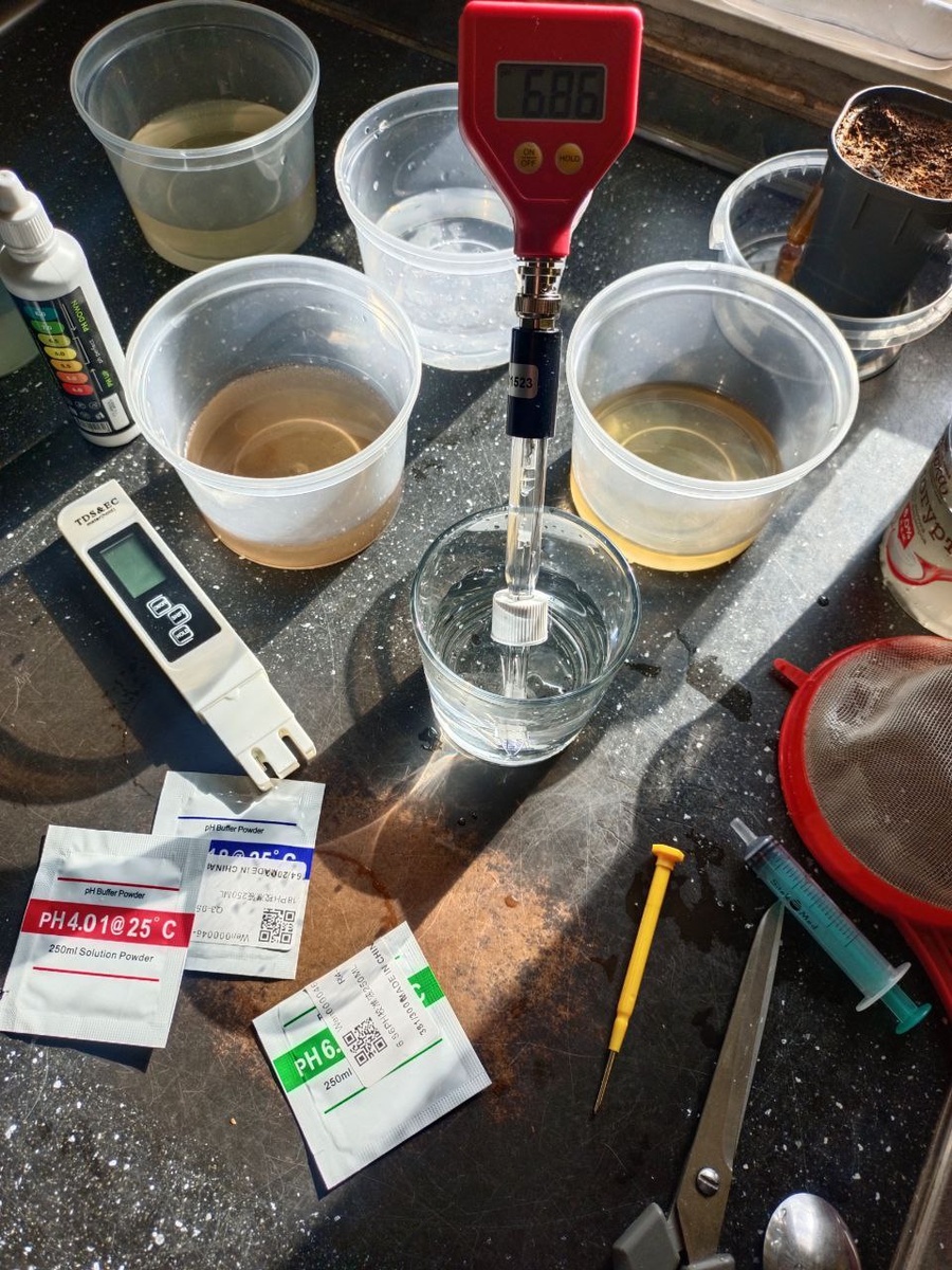А с утра — лаборатория. Измеряю электропроводность воды и уровень кислотности. Если pH не вызывает вопрос, в пределах 5.7-6.5 что слив с горшков, что вода с колодца, то вот ES показатель насторожил. С тех горшков, где растение зачахло, переувлажнилось, не смогло расти там уровень аж 7074. Это слишком губительно. У тех, кто развивается нормально пока не замерил. Ибо время завтрака!