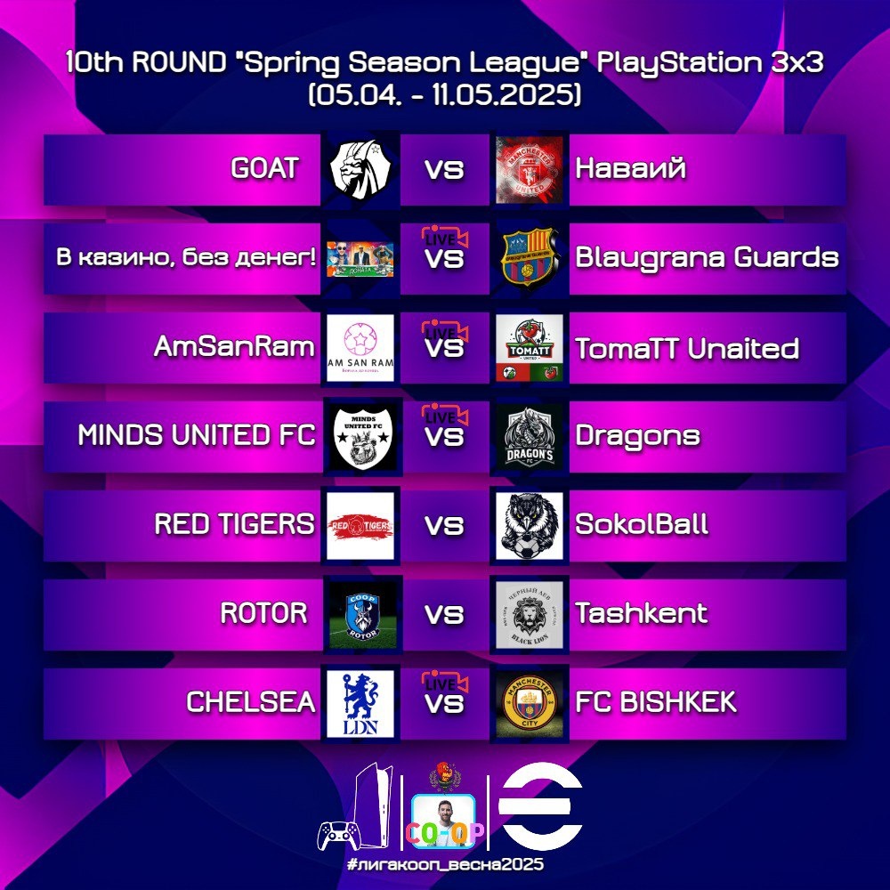 КООП пространство eFootball представляет вашему вниманию: 🙌 Открытие 10 тура 👑 "Spring Season League" для 3 на 3 и 2 на 2❗‼ ⌛ Отведенное на тур время: с 05.05. по 11.05.2025 📅 ☝Капитаны Команд начали обсуждать даты игр и назначать время #лигакооп_весна2025@coop_pesmakers #лигакооп_весна2025_EQLiga2x2@equlaizer_liga 🌐 https://pesmakers.tilda.ws/efootball-coop-league 🌐 https://eq-efootball.ru