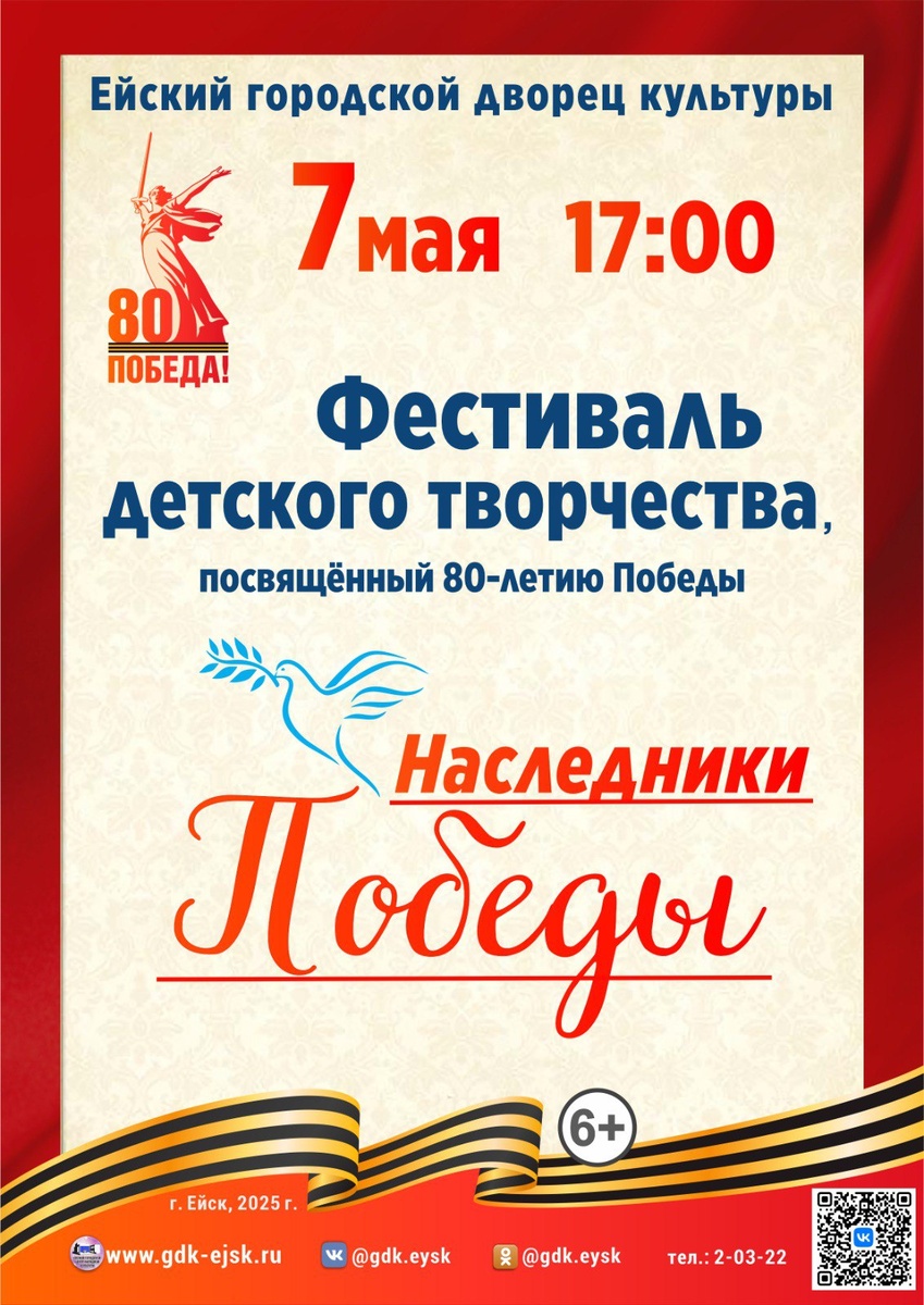 Уважаемые жители и гости города Ейска! Ейский городской дворец культуры поздравляет всех с наступающим праздником – Днём Великой Победы и приглашает 7 мая на тематический концерт с участием детских творческих коллективов ГДК «Наследники Победы!». День Победы навсегда останется самым большим и светлым праздником, отменить который не позволено никому, даже времени. Поколением победителей нужно восхищаться, пока мы будем помнить об этой войне – мы будем жить, будет жить Россия. Наш концерт – это огромная благодарность от современного поколения всем ветеранам ВОВ за счастливое детство. Ждем Вас 7 мая в 17:00 в концертном зале Городского Дворца культуры! С 16:00 в фойе ГДК будет проходить Всероссийская акция «Георгиевская ленточка», организованная участниками волонтёрского движения «Культурный код». Спасибо, что с нами!