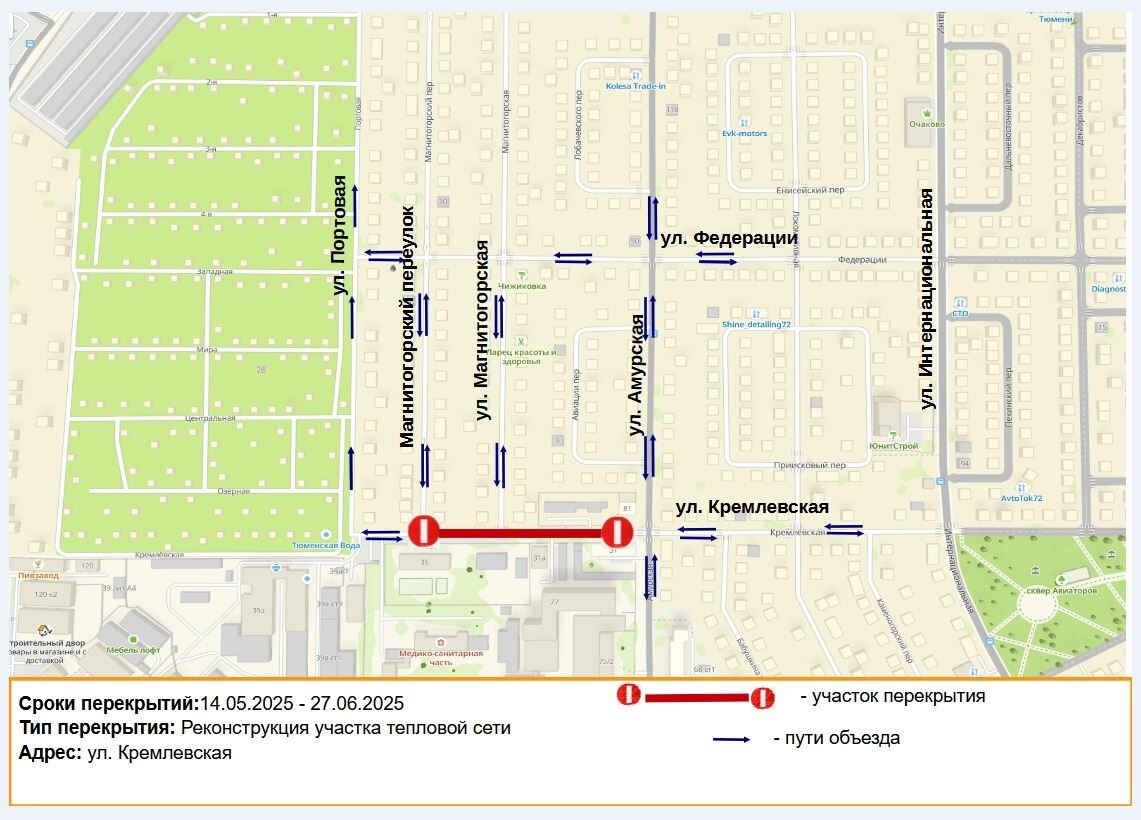 Улицу Кремлевскую временно перекроют В связи с выполнением работ по реконструкции участка тепловой сети в период с 14.05. по 27.06.2025 планируется прекращение движения транспорта на ул. Кремлевской от ул. Амурской до Магнитогорского переулка. Всем участникам дорожного движения рекомендуем заранее планировать маршрут, обращать внимание на знаки, соблюдать Правила дорожного движения РФ. Схемы объезда: ул. Амурская, ул. Магнитогорская, ул. Портовая.