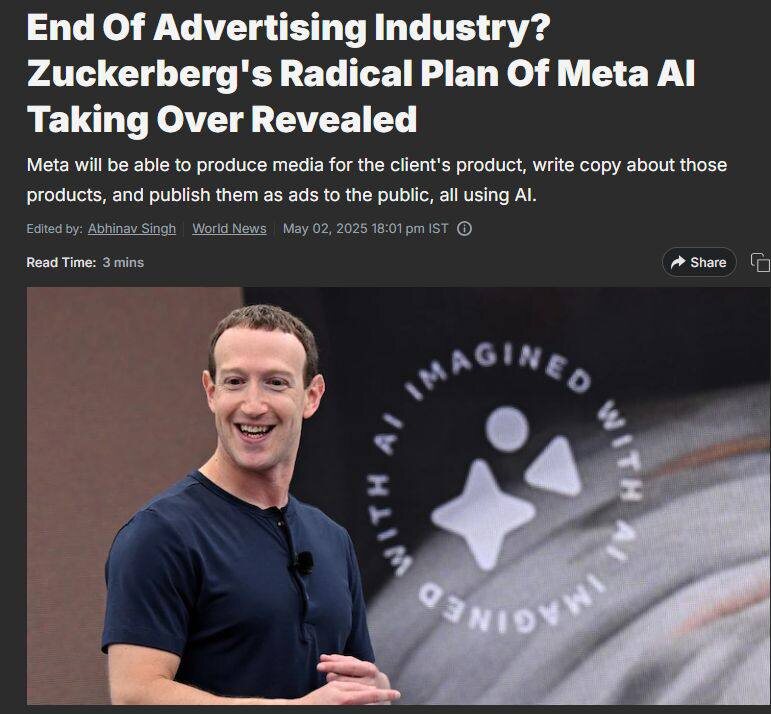 Цукерберг намерен уничтожить рекламный бизнес с помощью ИИ. В интервью Stratechery он отметил, что вскоре SMM-агентства в его социальных сетях исчезнут, так как нейросети смогут самостоятельно: