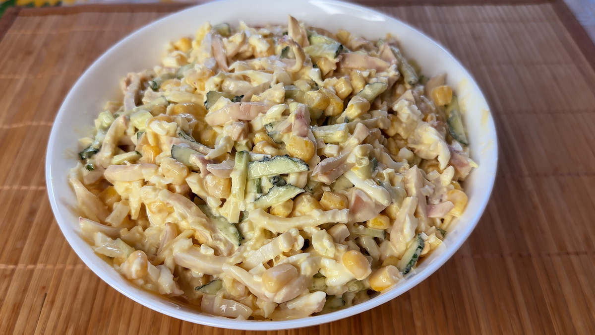 Привет, Друзья! Предлагаю Вам приготовить невероятнов вкусный и нежный салат с кальмарами. Он готовится очень быстро из доступных продуктов. С его приготовлением справится абсолютно любой. Для его приготовления нам понадобятся: Итак, нарезаем кальмары соломкой И высыпаем их в миску Берем яйца и натираем их на крупной терке На той же терке натираем сыр И на мелкой терке натираем чеснок Тонкими квадратиками нарезаем огурец Добавояем в миску консервированную кукурузу. Не забываем предварительно слить с неё жидкость Солим по вкусу И добавляем майонез. Кто майонез не любит, может добавить сметанну с горчицей или йогурт Хорошенько все перемешиваем Выкладываем в салатницу и подаем к столу Всем приятного аппетита!