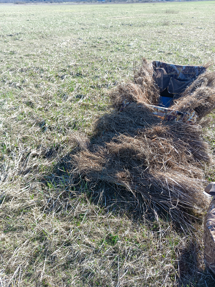 Скрадок забит еще с той охоты, нужно только чуть подправить маскировку. От изначально выбранного места, перетащил лежак метров на 300, где нашел несколько мочажин в низинке на зелёнке и метров 40 воды в колее трактора на пахоте. Расположил лежак под 45 градусов к границе пахоты. Так мне будет видно и поле и зеленку и лес, за которым где-то есть болота и поутру оттуда должны лететь гуси.
