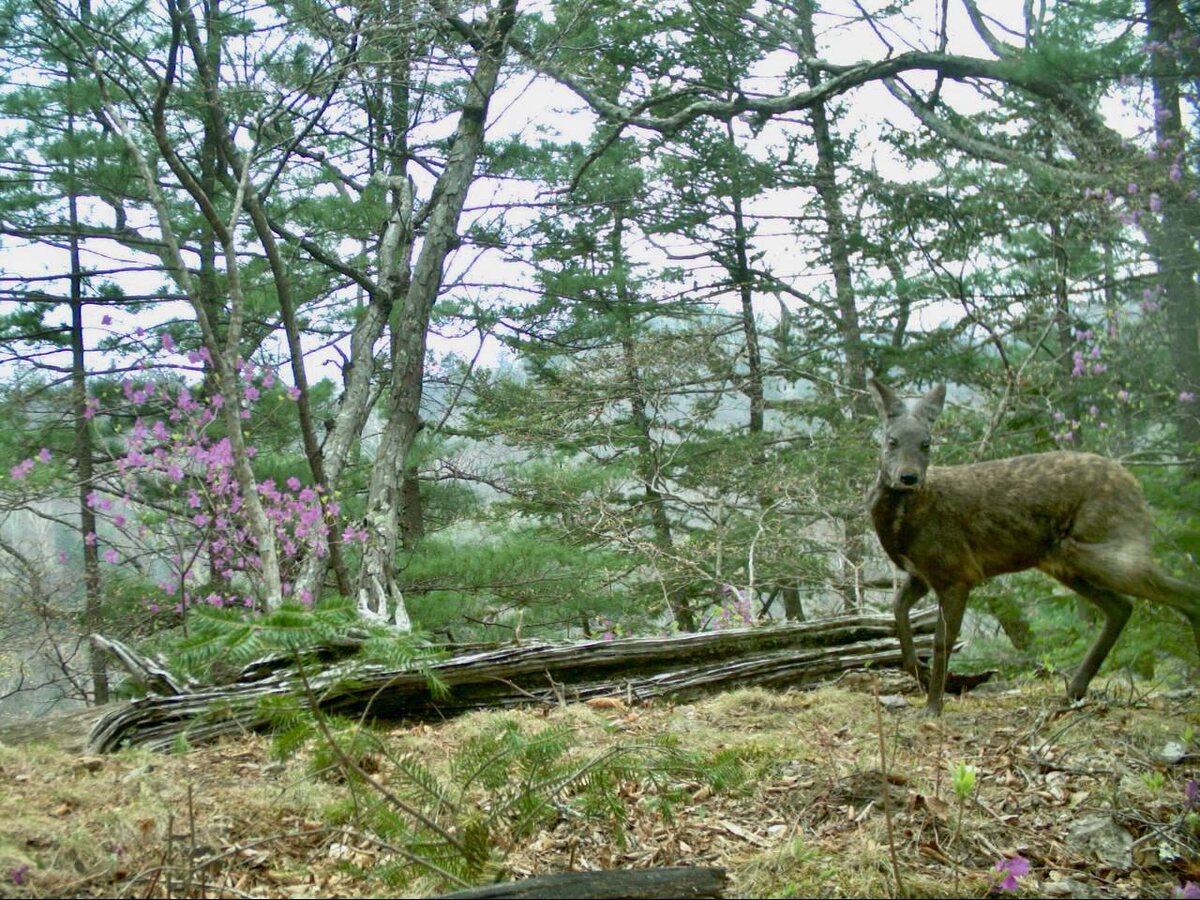Кабарга, конечно, хотела сделать вид, что невзначай проходила мимо распустившегося рододендрона перед скрытой камерой, но мы-то видим, как