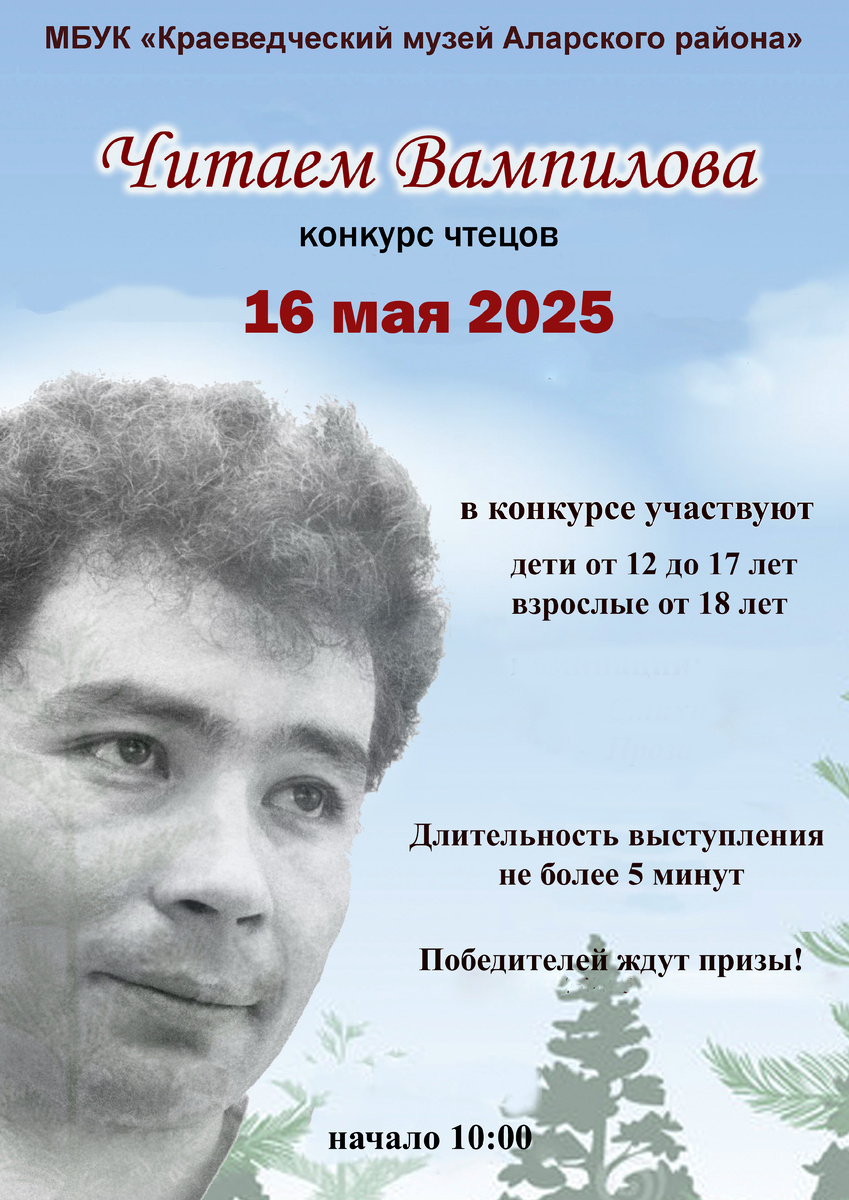Районный конкурс «Читаем Вампилова» проводится с 2020 года. Конкурс стал доброй традицией Мемориального музея драматурга. Это своеобразная дань памяти уважаемому земляку, попытка воскресить «вампиловское слово»… Для участия в конкурсе необходимо прочесть фрагмент из произведений Александра Вампилова (стихи, проза) или стихи о самом драматурге. Длительность выступления не более 5 минут. Конкурс чтецов - замечательная возможность самовыражения для всех, кто ценит художественное слово, читает вдумчиво и выразительно. Так и хочется добавить: и втайне мечтает о сцене. Для участников определены две возрастные категории: школьники от 12 до 17 лет и взрослые, старше 18 лет. Большинство участников конкурса составляют именно школьники. Это отличная проверка внутренних резервов, тренировка памяти, выдержки, самообладания. Для их руководителей участие в конкурсе - вопрос престижа, своеобразное подтверждение профессионального уровня. Самые главные оценочные критерии - "исполнительское мастерство"