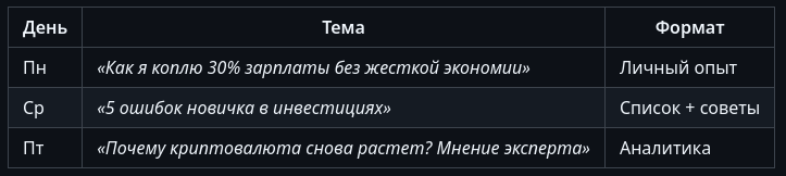 Один из ключевых факторов успеха в Яндекс Дзене — регулярность публикаций. Алгоритм любит активных авторов и охотнее продвигает их статьи. Но просто постить «когда есть время» — не лучшая стратегия. Нужен контент-план, который поможет сохранять стабильный поток публикаций и удерживать аудиторию. Минимум для старта Оптимальный вариант для роста Максимум (для монетизированных каналов) Важно! Лучше публиковать в разное время и тестировать, когда статьи набирают больше просмотров (обычно утро 7–9 и вечер 18–21). Дзен любит авторов с четкой тематикой. Выберите 3–5 ключевых направлений, например: ❗ Совет: Если темы слишком разные (например, кулинария + криптовалюты), алгоритму сложнее продвигать канал. Где брать темы? ✔ Тренды (Google Trends, подборки Дзена, соцсети). ✔ Комментарии под своими статьями (читатели подскажут, что их интересует). ✔ Конкуренты (смотрите, какие статьи набирают просмотры у других). ✔ Личный опыт (истории, кейсы, эксперименты). Пример контент-плана на неделю (тематик