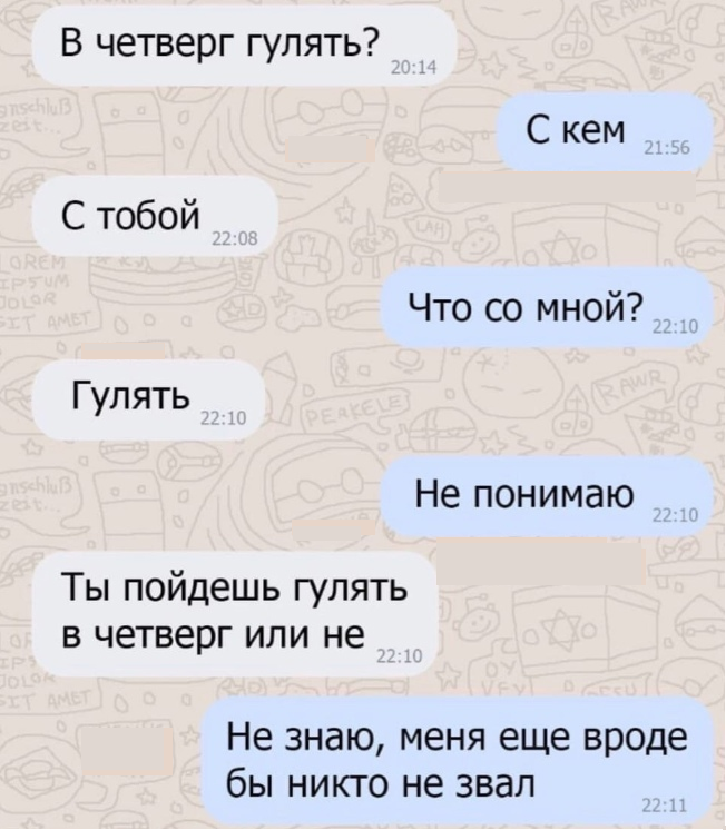 Недавно у BadFem было обсуждение по поводу чувства юмора парней. Что оно должно присутствовать, хотя бы на минималках. С этим, кстати, полностью согласна. Очень тяжело общаться с человеком без чувства юмора. И ладно ещё, если сам не шутит - лучше уж не шутить, чем, к примеру, натужно выдавать анекдоты с заплесневелой бородой - но понимать-то должен! Те же мемы, например. У нас со свекровью разное чувство юмора. И в том числе поэтому тяжеловато нам общаться. Всем, не только мне - и сыну, и внукам. И мужу её. И даже маме моей. То есть мы что-то там шутим, а она не понимает, что шутка (даже по весёлым лицам не понимает, ну как так-то?), начинает спорить, возмущаться. Доказывать, что так неправильно. Уф. *** Нда. Ну, так вот. Старший мой жалуется на свою девушку. Я, честно говоря, предполагала, что это на него будут девушки жаловаться. Но нет. Тут, тоже, оказывается, претензии некоторые накопились. Не хочет она с ним гулять. С ним и его друзьями. -Сидит и сидит дома. Мне, говорит, ком
