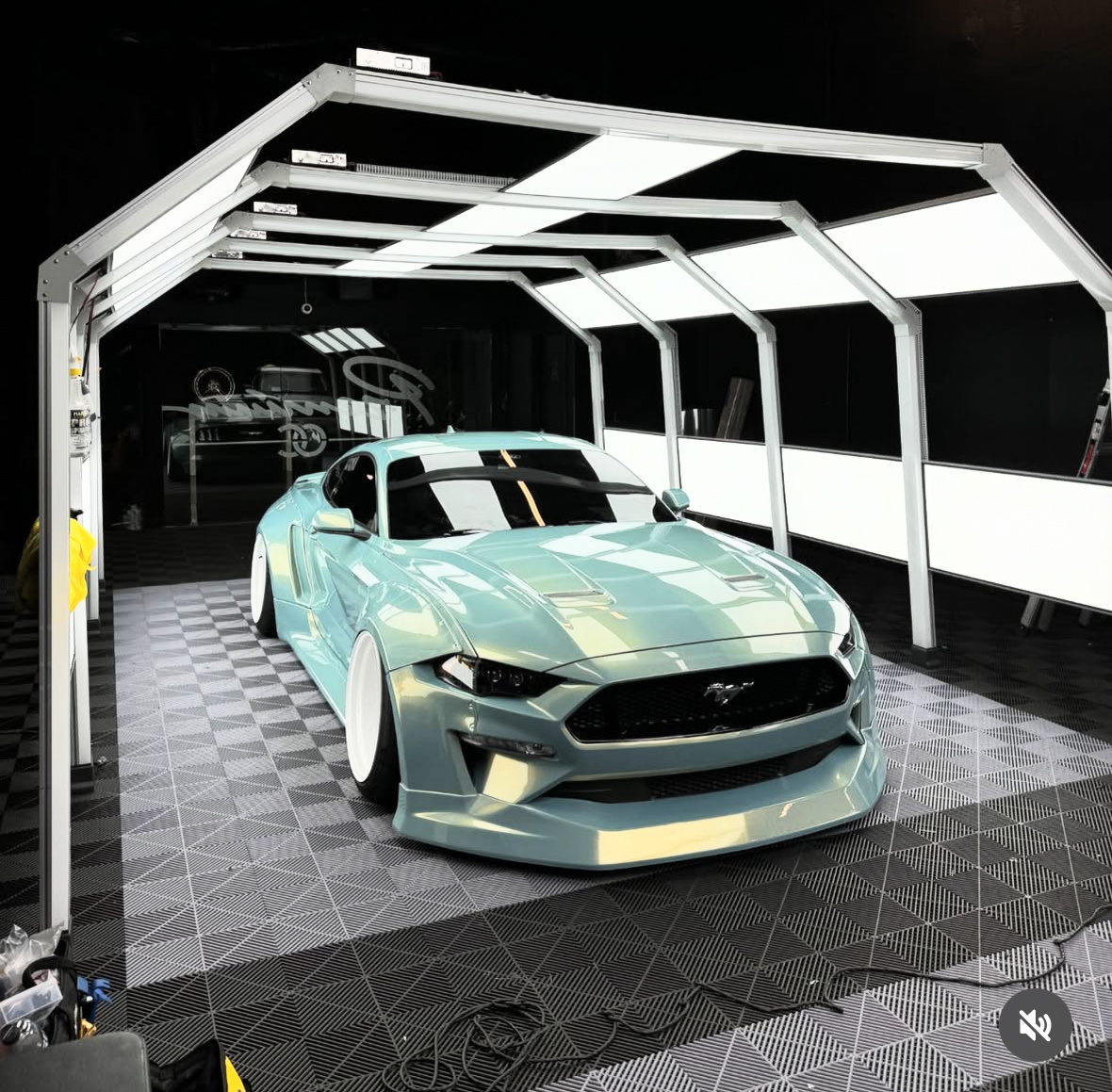 Перед вами — проект, который либо вызывает восторг, либо желание срочно перевести взгляд. Третьего не дано. Владелец решил, что стандартный "пони-кар" — это слишком скучно. В ход пошел широкий обвес от Clinched, тот самый, что с клепками, будто кузов собирали на коленке где-то в Северной Каролине под музыку из «Форсажа». По духу он, конечно, ближе к Liberty Walk — такие же расширенные арки, будто машина вот-вот превратится в трансформера. Каждое крыло шире заводского на добрых четыре дюйма. Передний сплиттер настолько низко, что владельцу, вероятно, выдают в комплекте запасной — на случай каждого лежачего полицейского. Боковые юбки, новый сетап подвески, кастомные белые колеса от ESR. Ну и, конечно, пленка. Это не просто голубой цвет. Это оттенок под названием Pearl Urban Bamboo от Inozetek — и звучит он примерно так же, как выглядит. Немного зеленого, немного бирюзы, немного золотого блеска. Нравится вам это или нет — неважно. Владелец доволен, и это его Mustang мечты. А вы, если зах