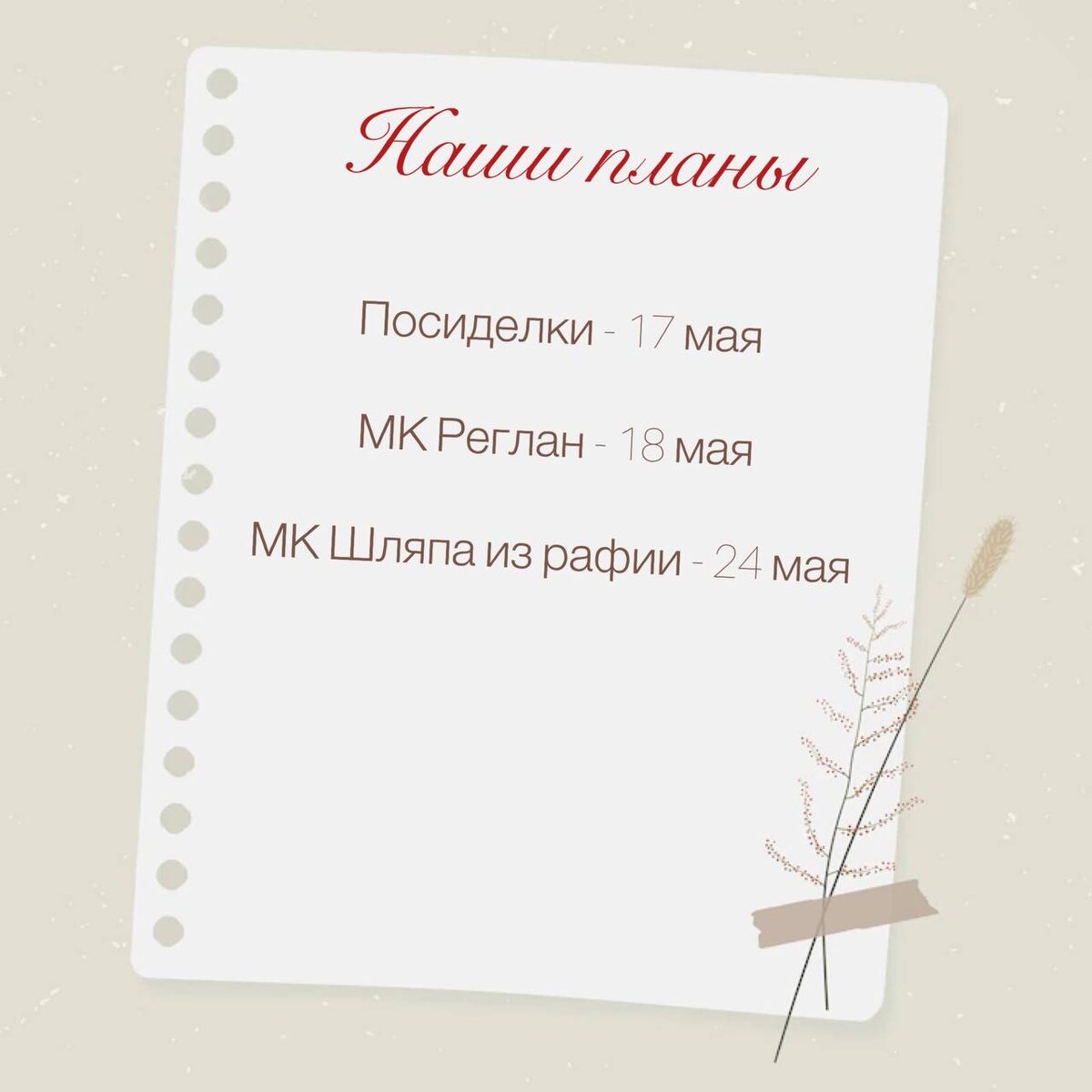 Привет, новая неделя! Пора строить планы. 17 мая, в субботу, ждем вас на наши посиделки. Как обычно, в 13.00. 18 мая, воскресенье - заключительный мастер-класс Реглан. Последний в этом сезоне. Кто пропустил, обязательно приходите! Будет дополнительный пост с записью. 24 мая, суббота - мастер-класс Шляпа крючком. Научимся вязать базовую шляпу из рафии. Будет дополнительный пост с записью. А у вас какие планы на май?