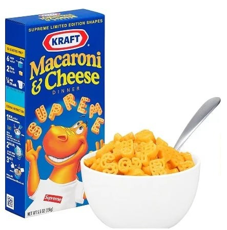 На Западе очень популярны mac'n'cheese. По сути, это макароны, вместе с которыми в коробки кладут пакетик с сыром, истертым в порошок. По умолчанию процесс приготовления несильно сложнее обычных макарон. После того, как сами макароны сварены, их снова возвращают в кастрюлю, поверх кладут масло, заливают молоком, посыпают сырным порошком и размешивают до того момента, пока все не превратится в единую массу. Буквально на днях компания Kraft, которая изготавливает mac'n'cheese, запустила коллаборацию с крупным фэшн-брендом Supreme. С 17 февраля в магазинах и на сайте Supreme продаются mac'n'cheese, из которых можно сложить название популярного бренда. Акция приурочена к выходу весенне-летней коллекции Supreme. Несмотря на изменившуюся форму, рецепт приготовления остался прежним, уверяет производитель.