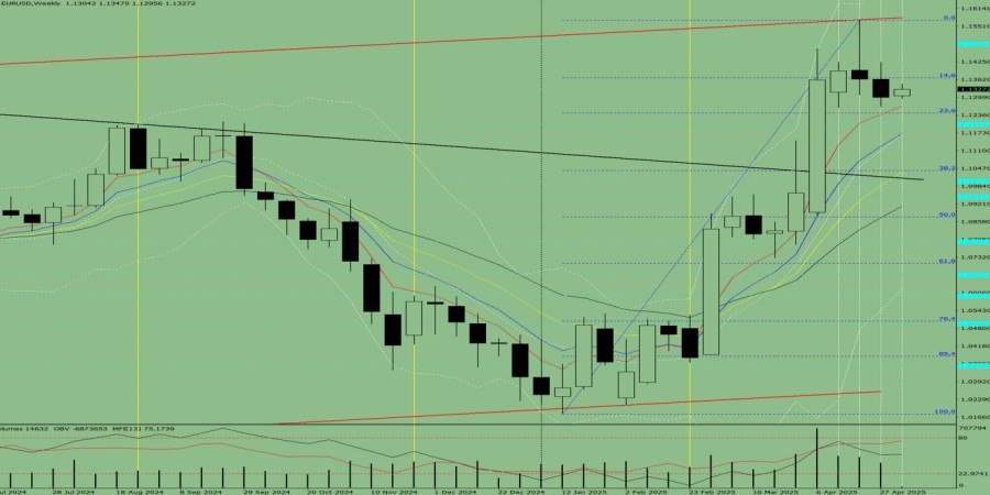 https://basechop.ru/wordpress/?p=41187 Трендовый анализ (рис. 1). На этой неделе рынок от уровня 1.1299 (закрытие последней недельной свечи) может начать движение вверх с целью 1.1368 – откатный уровень 14.6% (синяя пунктирная линия). При тестировании этого уровня, возможно, цена продолжит движение вверх с целью 1.1488 – исторический уровень поддержки (голубая пунктирная линия). Рис. 1 (недельный график). Комплексный анализ: – индикаторный анализ – вверх; – уровни Фибоначчи – вверх; – объёмы – вверх; – свечной анализ – вверх; – трендовый анализ – вверх; – линии Боллинджера – вверх; – месячный график вверх. Вывод по комплексному анализу: восходящее движение. Общий итог расчёта свечи валютной пары EUR/USD по недельному графику: цена на неделе, вероятней всего, будет иметь восходящую тенденцию с отсутствием первой нижней тени у недельной белой свечи (понедельник – вверх) и наличием второй верхней тени (пятница – вниз). Альтернативный сценарий: пара от уровня 1.1299 (закрытие…