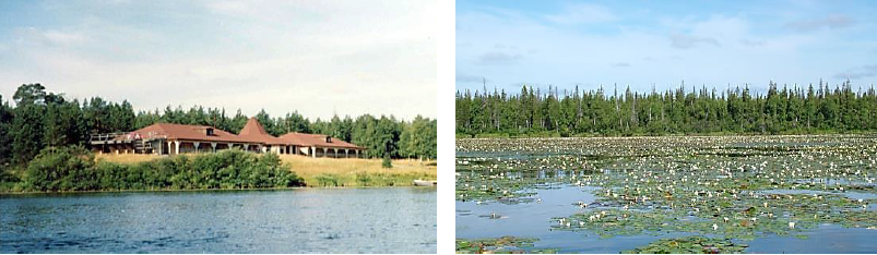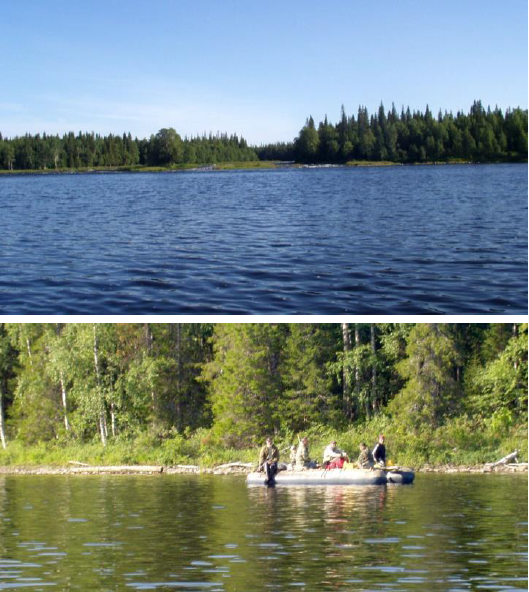 Около часа гребём по озеру в направлении на юго-запад, затем поворот на 90º на юго-восток. В месте поворота остров, а озеро перегорожено поперёк сетями для отлова идущей на нерест сёмги. На левом берегу домик, видно людей. Сети высоко подняты над водой, но в середине есть проход для лодок. Наши катамараны прошли спокойно. Сёмги в кошелях не видно.